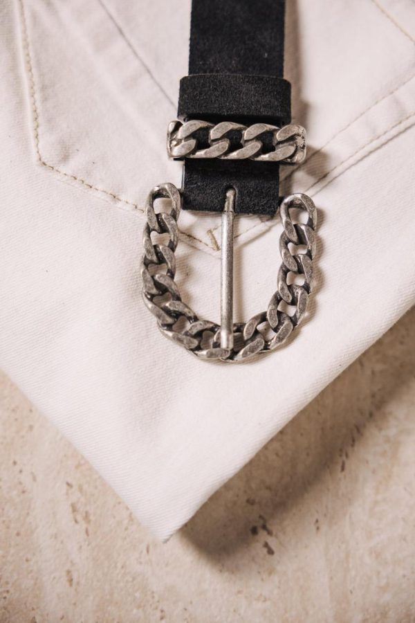 • Boucle et 1 passant en métal argenté travaillé et veilli