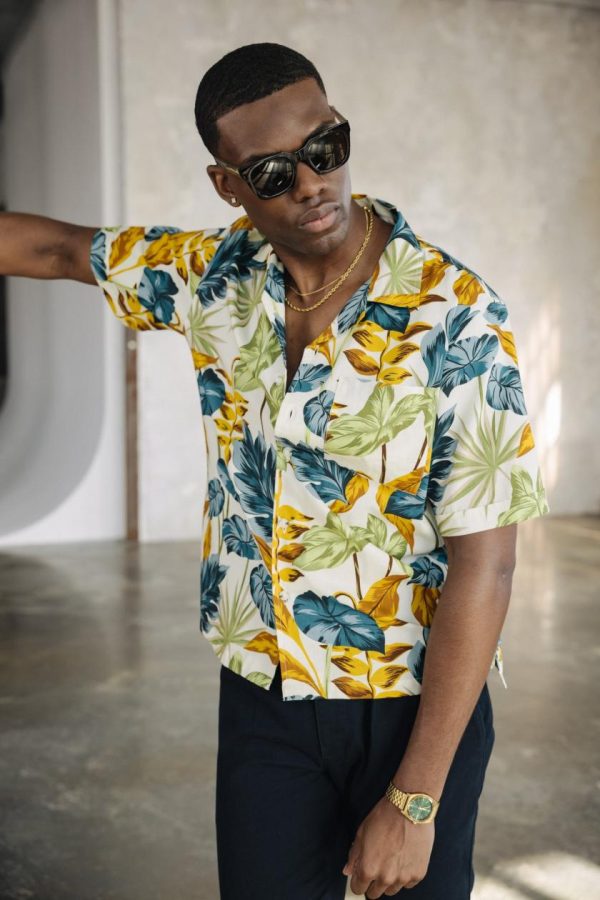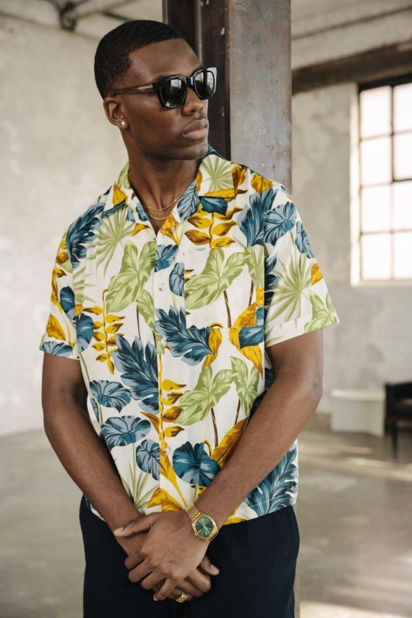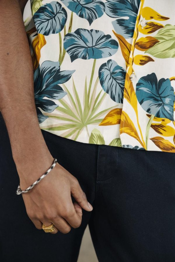 • Motif feuilles tropicales dans les tons jaunes et bleus