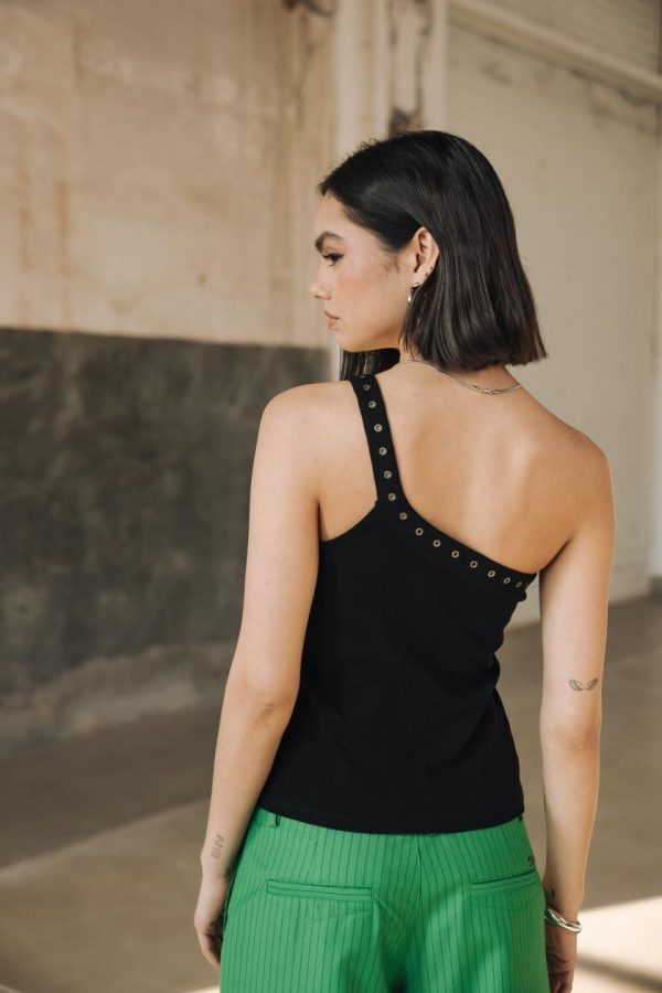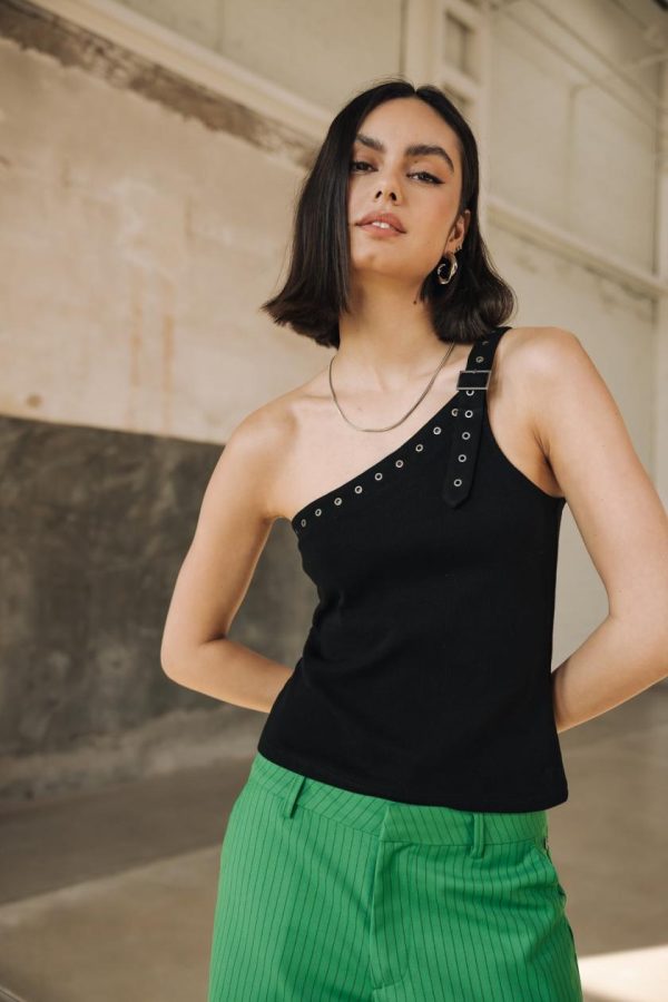 • Top asymétrique en jersey uni entièrement cotelé
